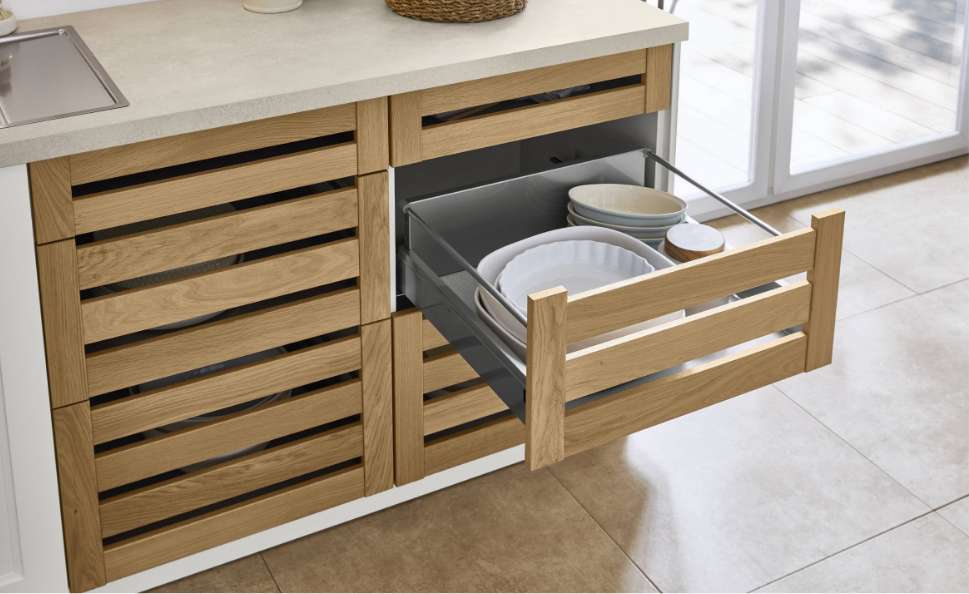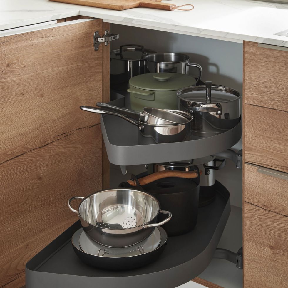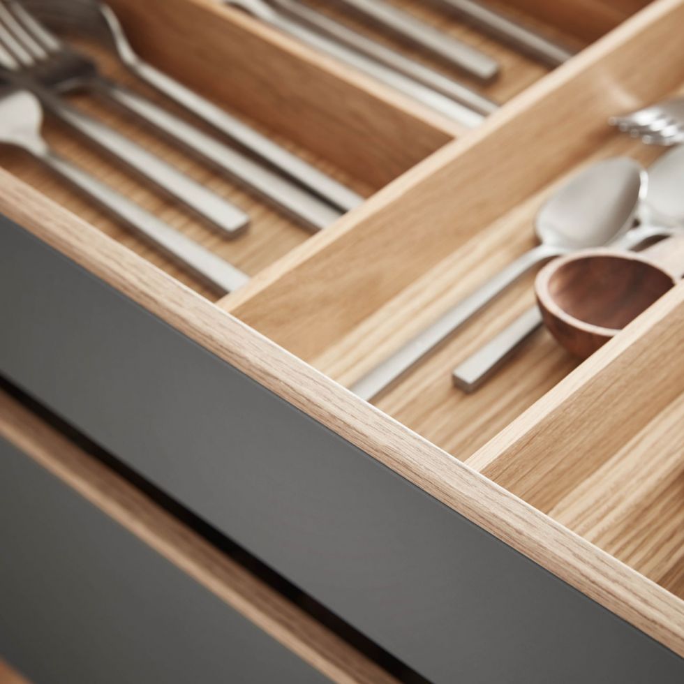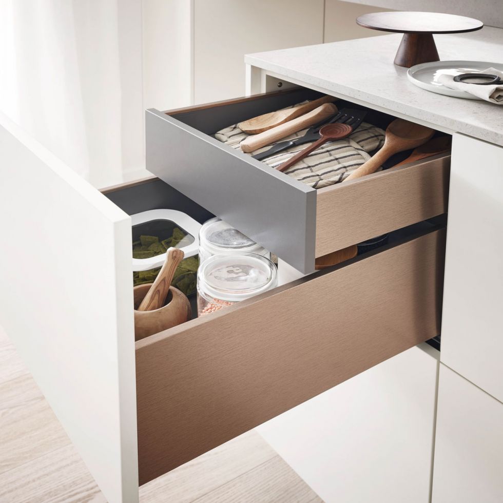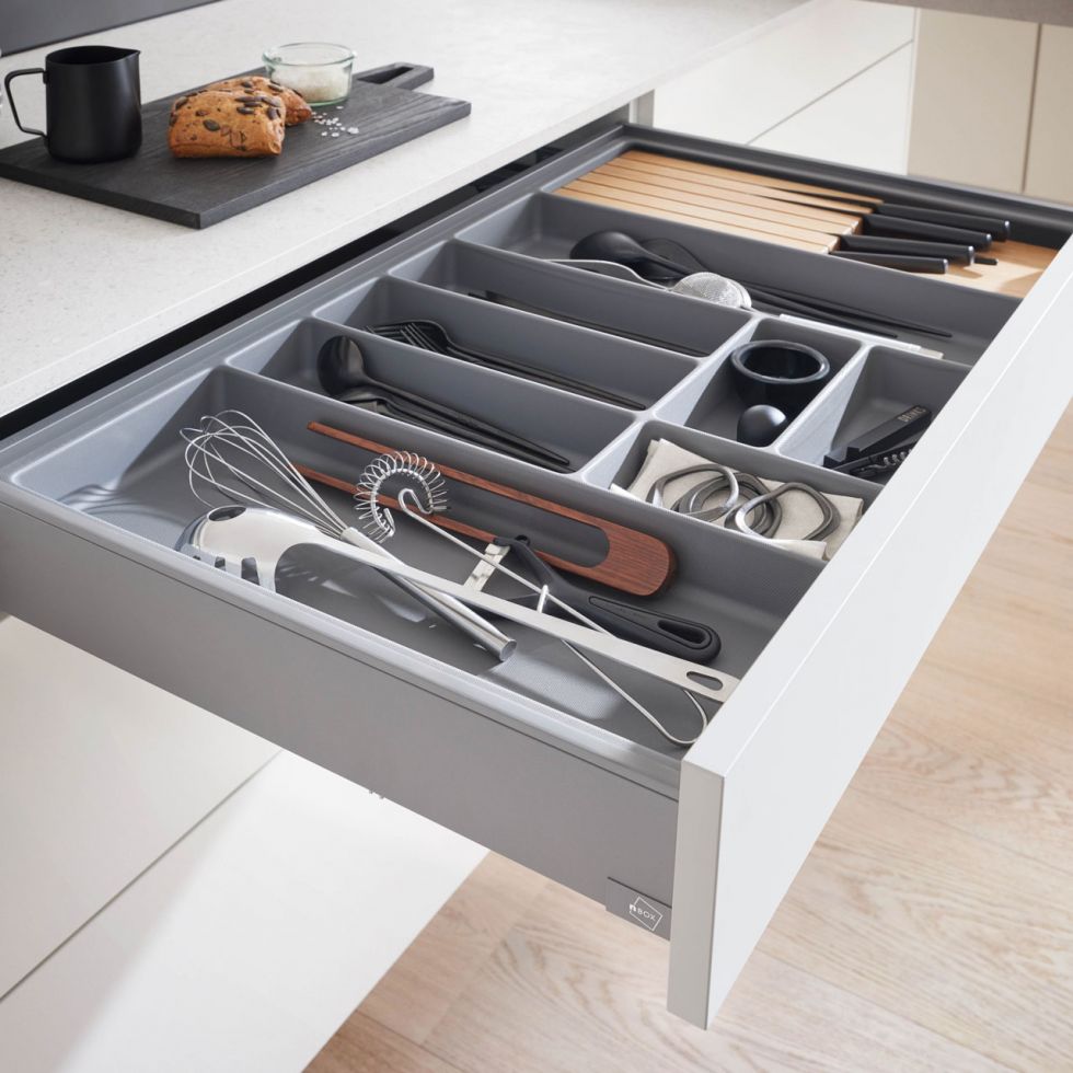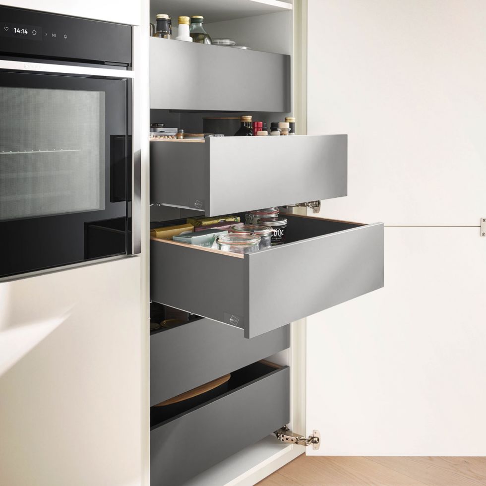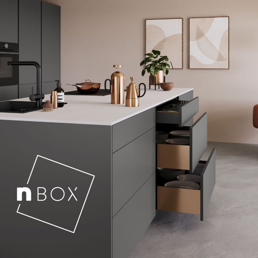 Met nBOX worden nieuwe maatstaven gezet op het gebied van ladetechnologie. Als standaard in de serie biedt het niet alleen een premium design, maar ook meer comfort en uitgebreide personaliserings-mogelijkheden dankzij design-covers en -profielen. De kleur leigrijs geeft het interieur bovendien een elegante uitstraling. De perfecte oplossing voor keuken, badkamer en woonkamer – een functioneel systeem voor elke ruimte.