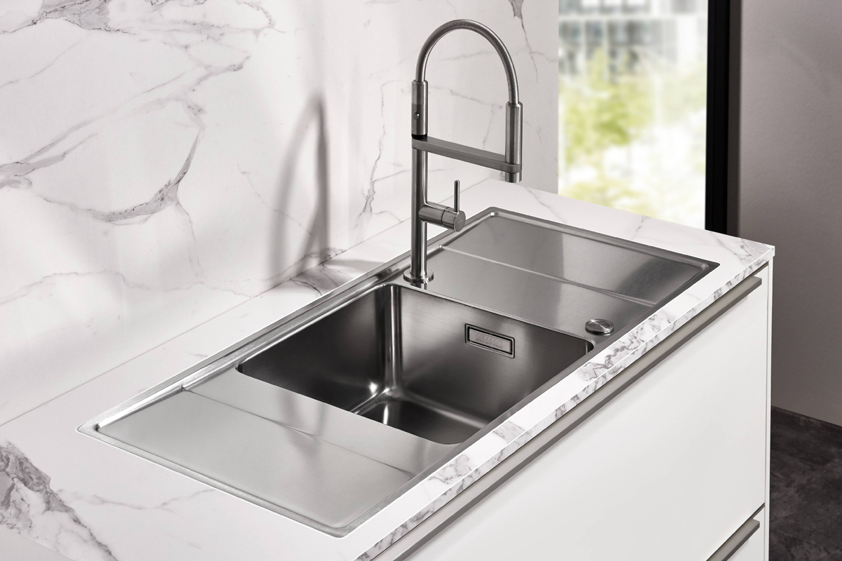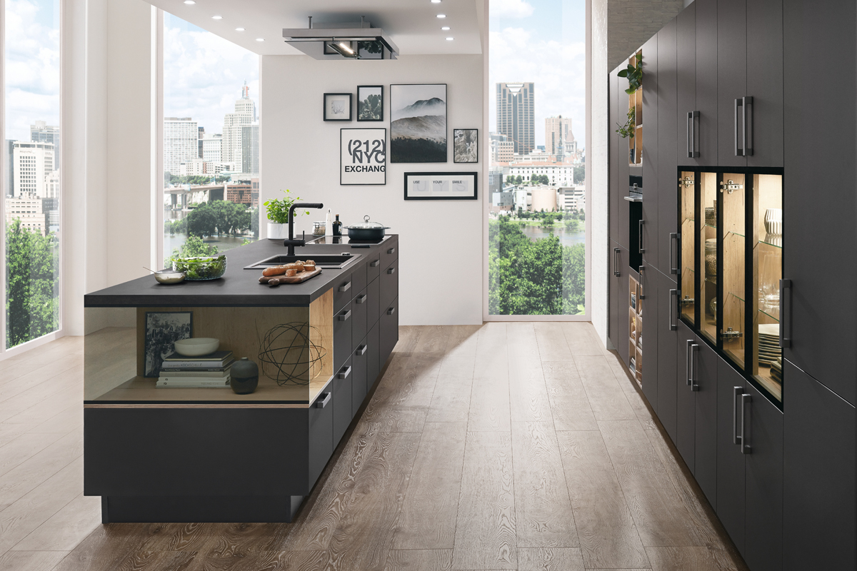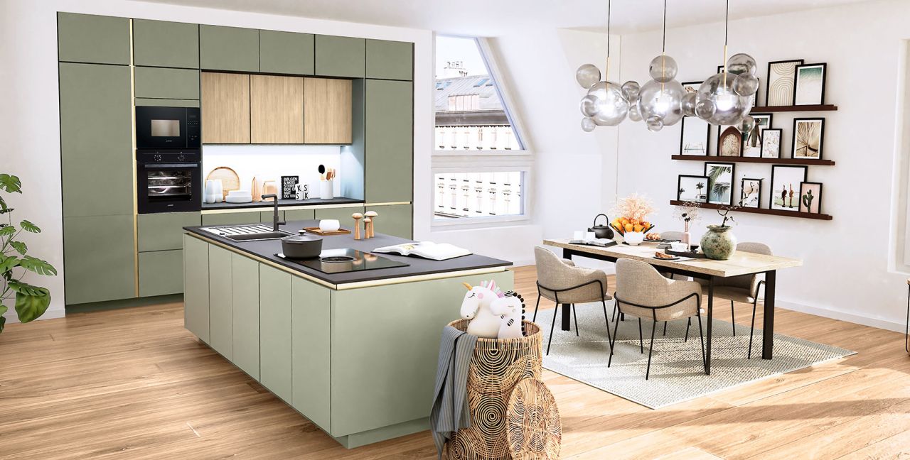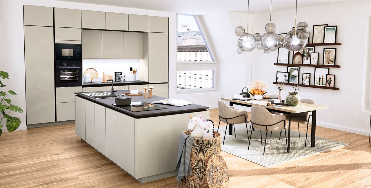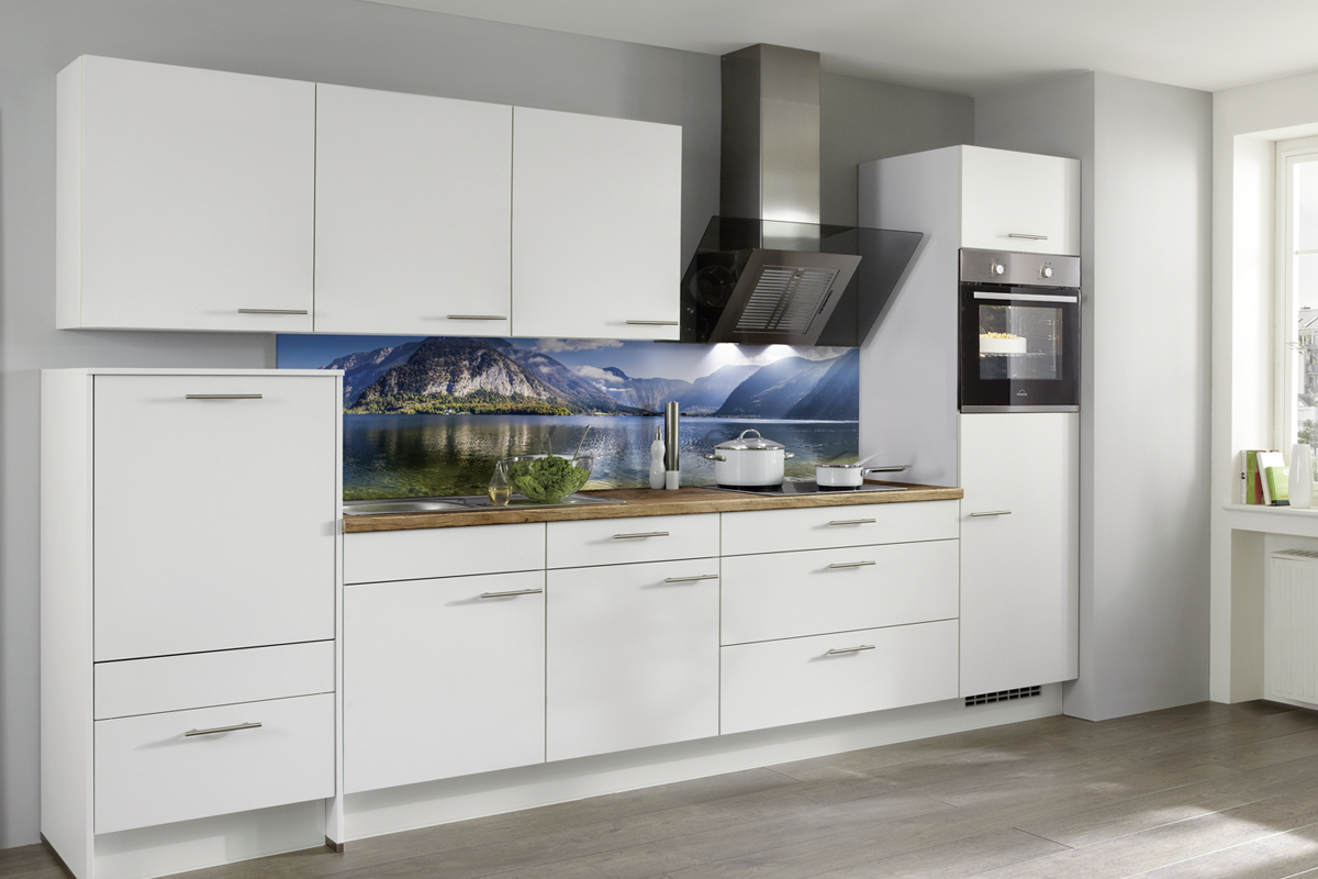 Inclusief inbouwoven zwart Siemens HB234ABB3 Energieklasse A+, keramische kookplaat met inductie en werkbladafzuiging (circulatielucht) Bora GP4U, koelkast Laurus LKG88E Energieklasse E, magnetron Junker JP4119260, volledig geïntegreerde vaatwasmachine Laurus LSV60-4 Energieklasse E, inbouw-designspoelbak Elleci Logik 300, XL-kasten, onderkast met uittrekinterieur, wandkasten met klapdeur.